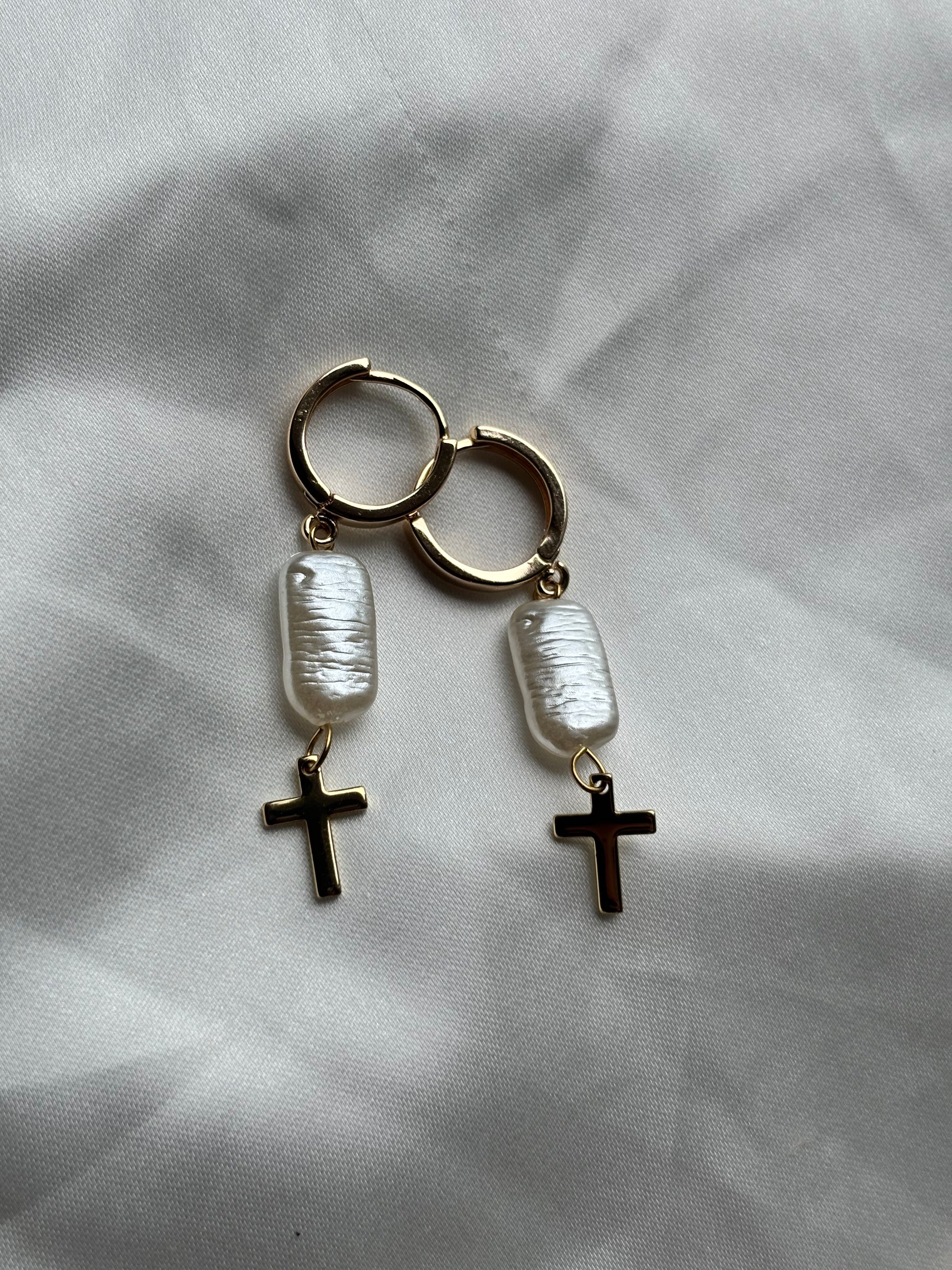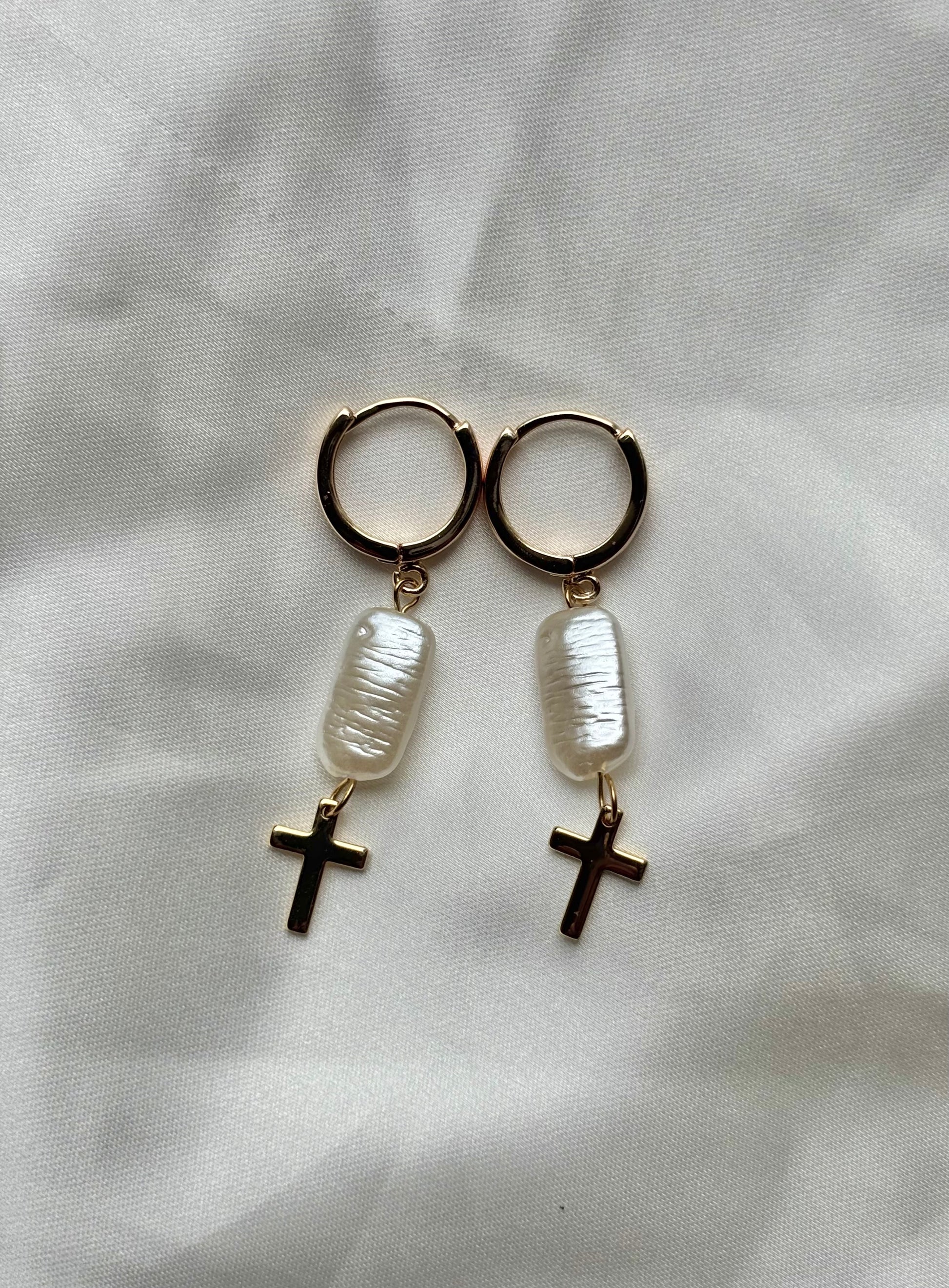 Introducing the Corina Earrings, unique hoops featuring a long faux pearl and delicate cross for a modern twist on a classic accessory. Elevate any outfit with these elegant earrings that add a touch of sophistication. Perfect for both everyday wear and special occasions.